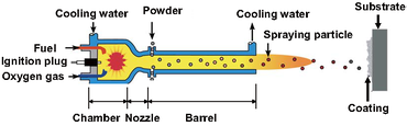 在20世纪80年代,开发了一类称为高速氧燃料喷涂的热喷涂工艺。 将气态或液态燃料和氧气的混合物送入燃烧室 ,在那里它们被点燃并连续燃烧。ꦍ 在接近1MPa的压力下产生的热气体通过会聚 - 发散喷嘴散发并穿过直线部分。 燃料可以是气体( 氢气, 甲烷 , 丙烷 , 丙烯 , 乙炔 , 天然气等)或液体( 煤油等)。 枪管出口处的射流速度(> 1000 m / s)超过声速 。 将粉末原料注入气流中,使粉末加速至800m / s。 将热气体和粉末流导向待涂覆的表面。 粉末在流中部分熔化,并沉积在基材上。所得涂层具有低孔隙率和高粘合强度 。